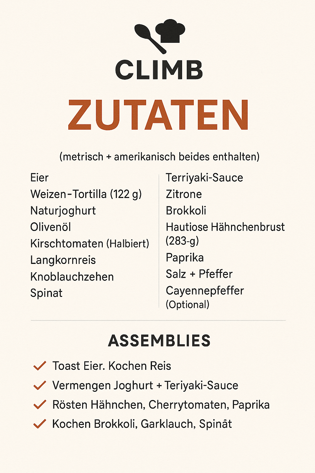 Seite 1: Cover, Mini-Überblick, Zutatenliste (metrisch + imperial)