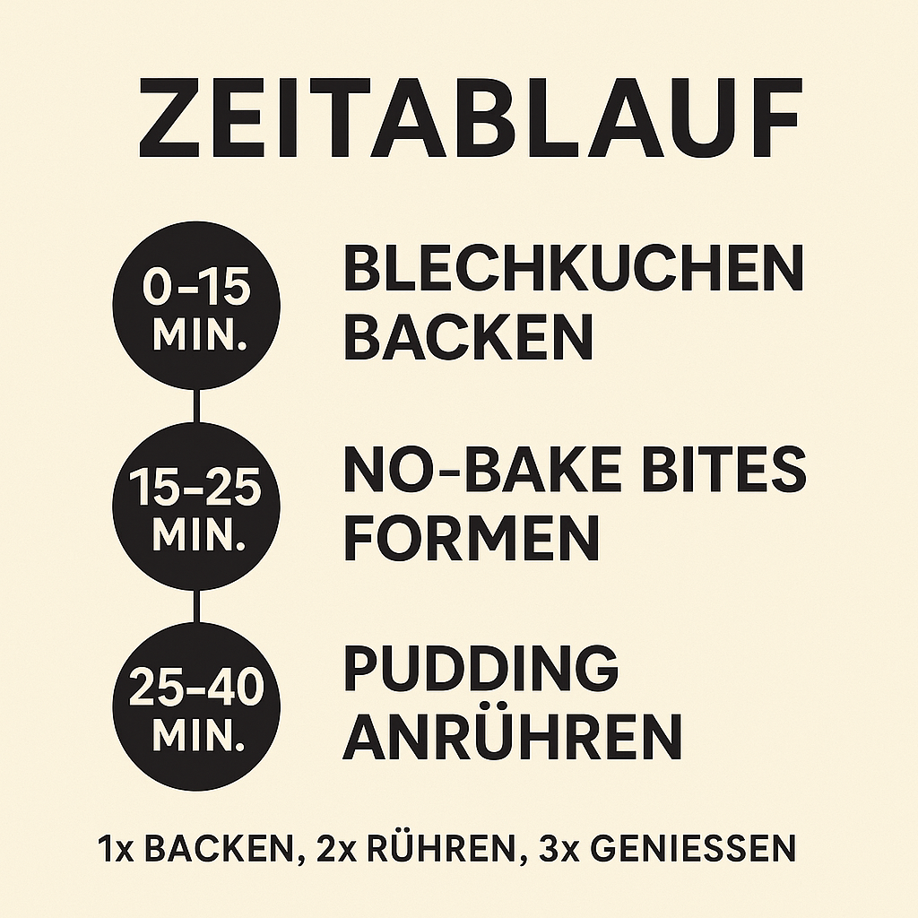 De zoete Gold-Chef-editie: één keer in batch bakken/roeren en daaruit 3 desserts voor één dag – bakplaatcake, no-bake bites en romig lepeldessert. Minimale inspanning, duidelijke stappen, prep-light.