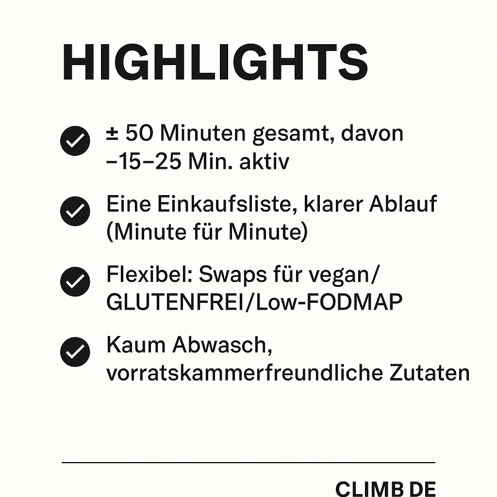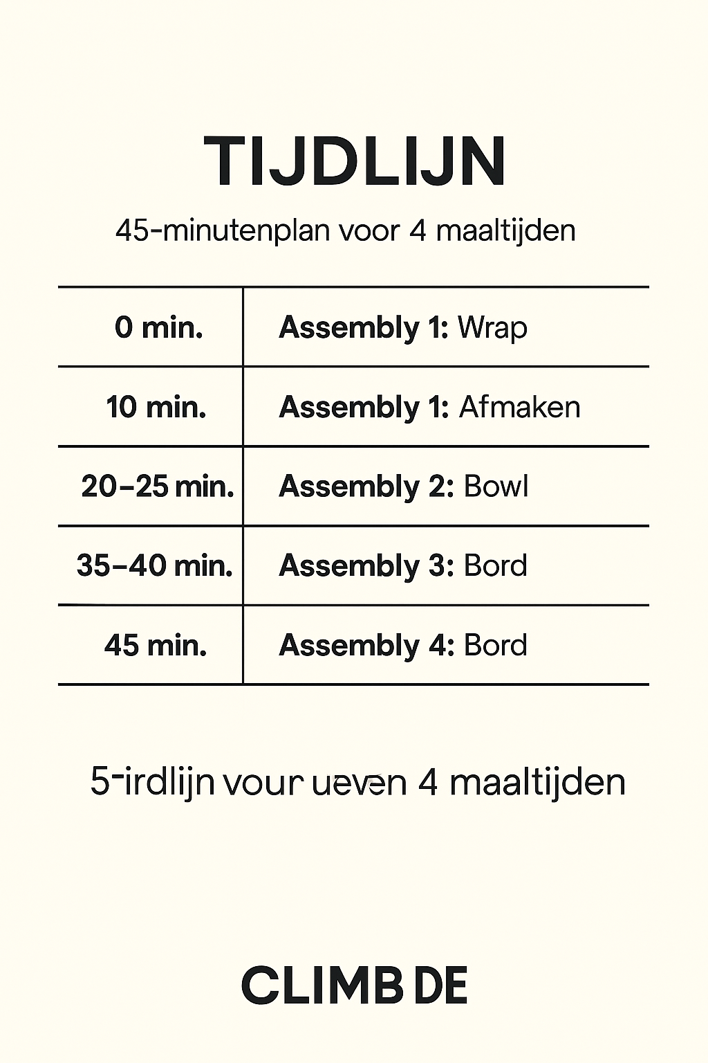 Één kooksessie van 45 minuten levert 4 eetmomenten op: Breakfast Wrap, Lunch Bowl, Dinner Plate + Sweet Bite. Heldere minuut-voor-minuut tijdlijn, boodschappenlijst (metrisch + imperial), macro-checks en allergenenmatrix. Prep-light, weinig afwas, maximale output.